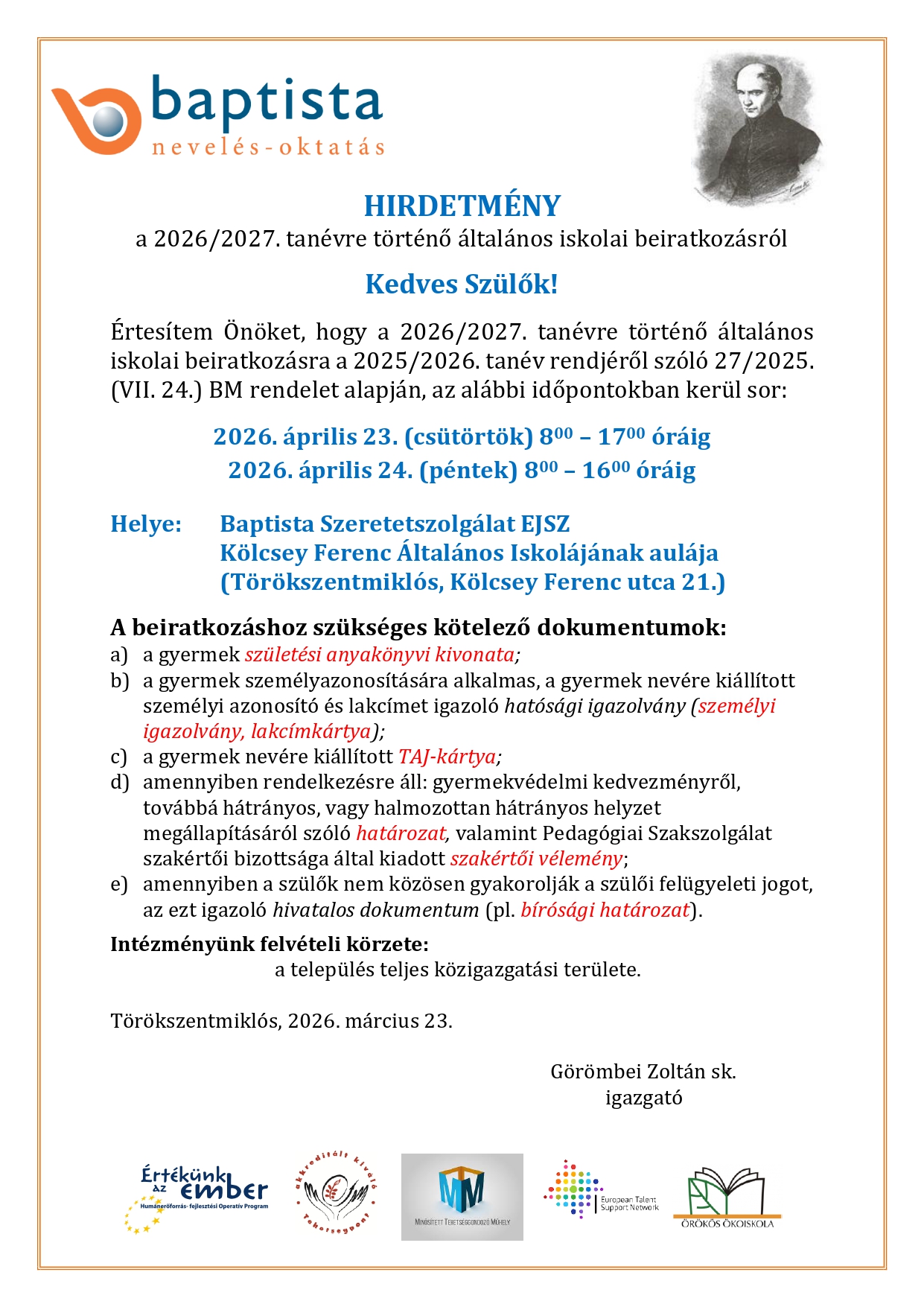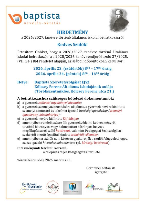 Iskolai hirdetmény a beiratkozásról 2026-2027