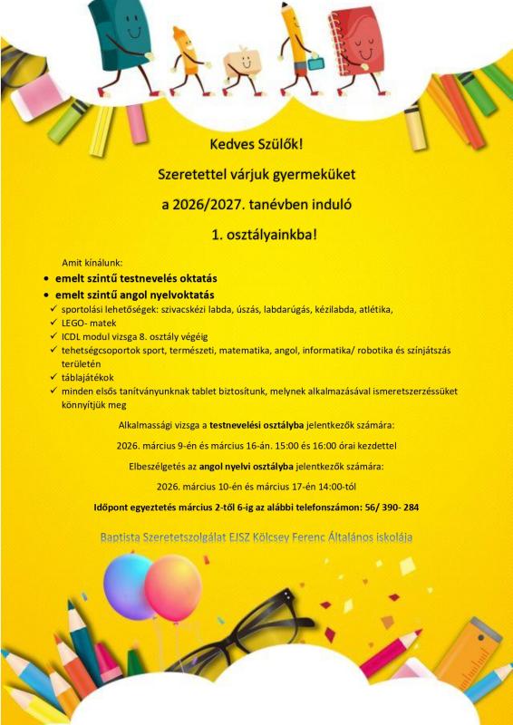Szeretettel várjuk gyermeküket a 2026/2027. tanévben induló 1. osztályainkba