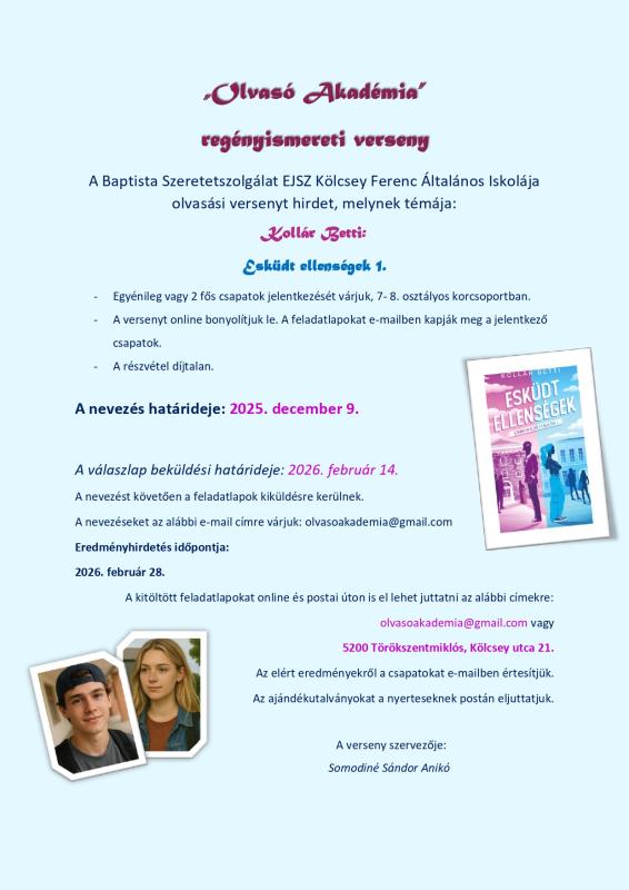 A Baptista Szeretetszolgálat EJSZ Kölcsey Ferenc Általános Iskolája olvasási versenyt hirdet, melynek témája: