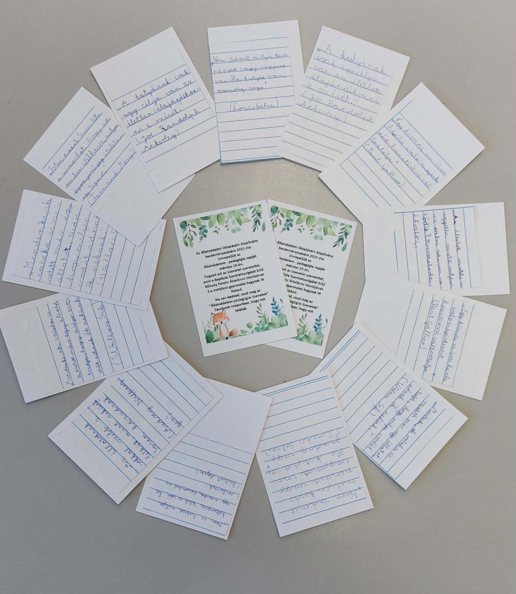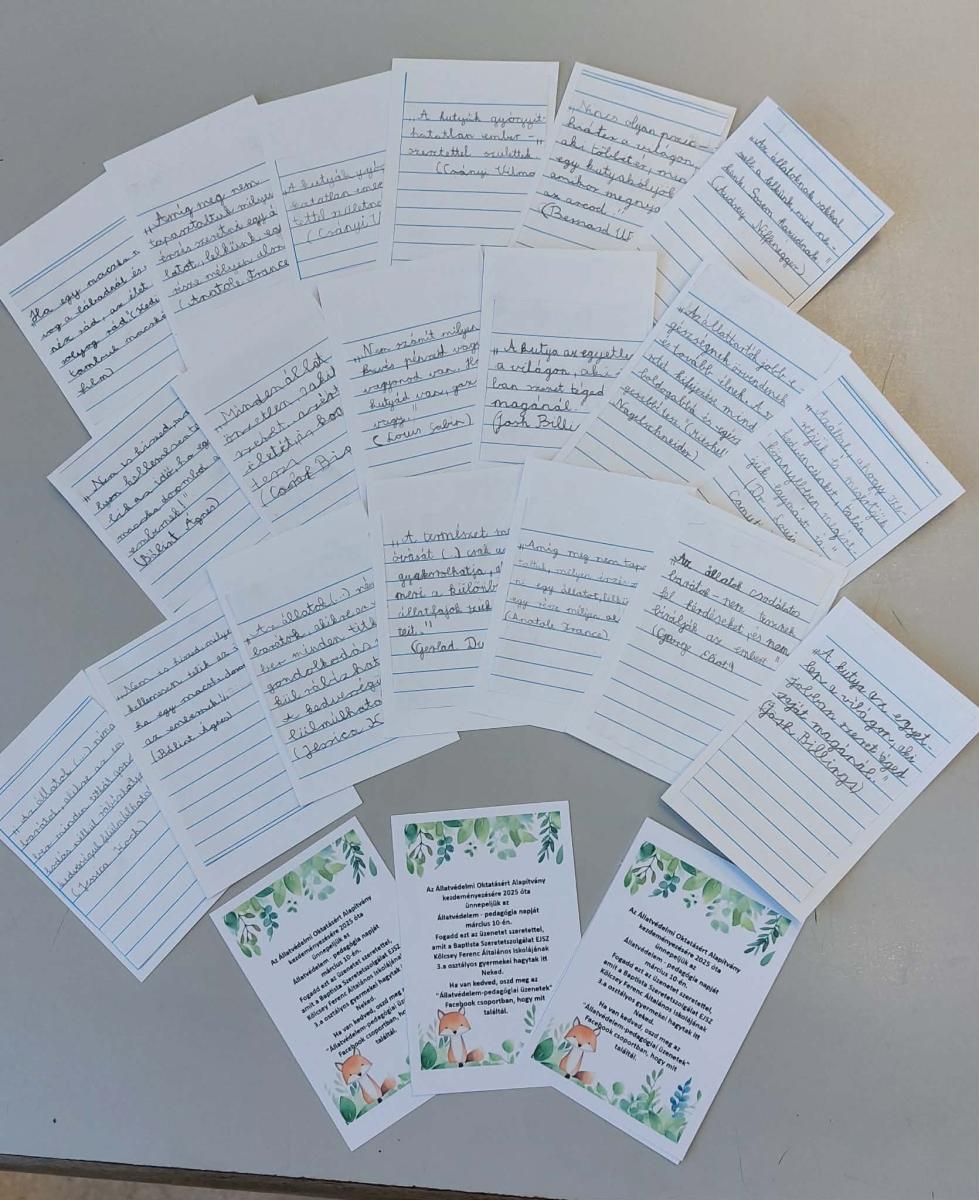 Ebben a tanévben a 3.a osztály tanulói vállalták, hogy az általuk megírt kedves kis üzeneteket és állatfigurákat elrejtik a város különböző pontjain, hogy a szemfüles járókelőknek örömet szerezhessenek, illetve egyúttal felhívják a figyelmet az állatszerető és állatbarát szemlélet elmélyítésére a gyermekek és felnőttek körében egyaránt.
